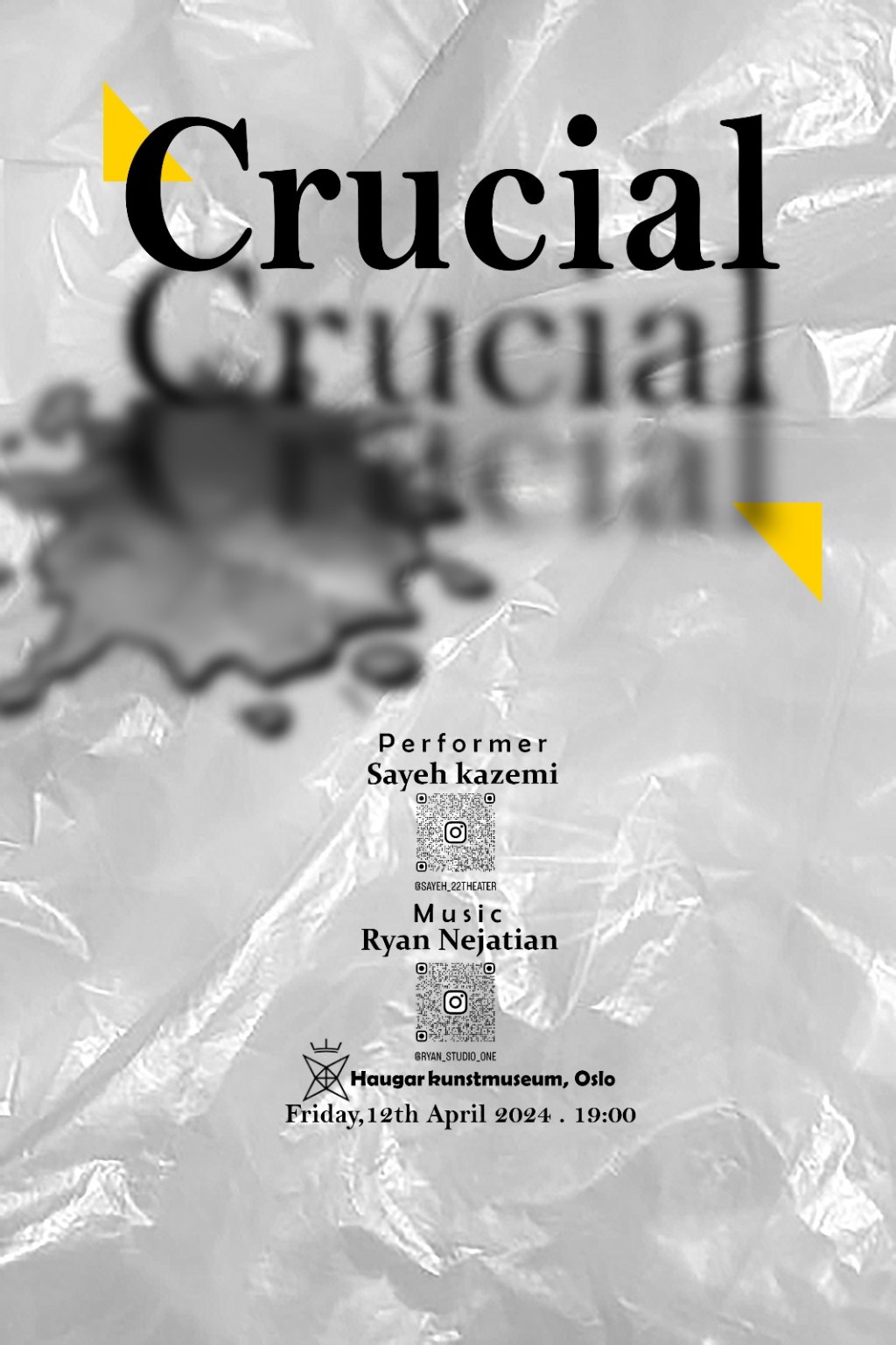 The performance ‘Crucial’ stands as a exploration of the intertwined struggles and triumphs of women’s liberation, intricately into the symbolic tapestry of oil and vulnerability. Through the visceral imagery of a large barrel submerged within an oil-filled box and a naked performer enveloped in cellophane, the artwork unveils a narrative of societal constraints and female resilience.